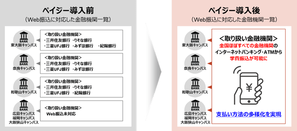 近畿大学(大阪府東大阪市)は、株式会社NTTデータ関西(大阪府大阪市)と連携し、学費納入システムに、全国ほぼすべての金融機関のインターネットバンキングやATMから振込が可能な「Pay-easy(以下:ペイジー)」を導入します。これにより、学費納入においてWeb振込に対応した金融機関を拡充し、利便性向上とさらなるペーパーレス化の推進を図ります。