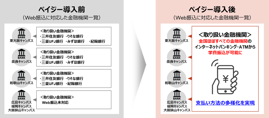 本システムにペイジーを導入することで、全国ほぼすべての金融機関のインターネットバンキング・ATM※ から学費が納入できるようになります。