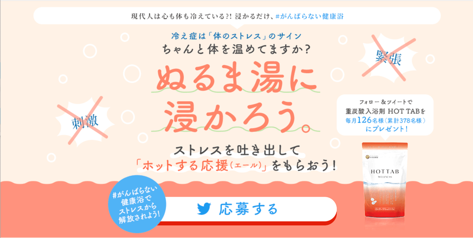 2021年12月16日〜2022年2月28日の期間中、Twitterで@hottab_officialをフォローのうえ、日頃のストレスを『#がんばらない健康浴』のハッシュタグを付けてツイートしてください。