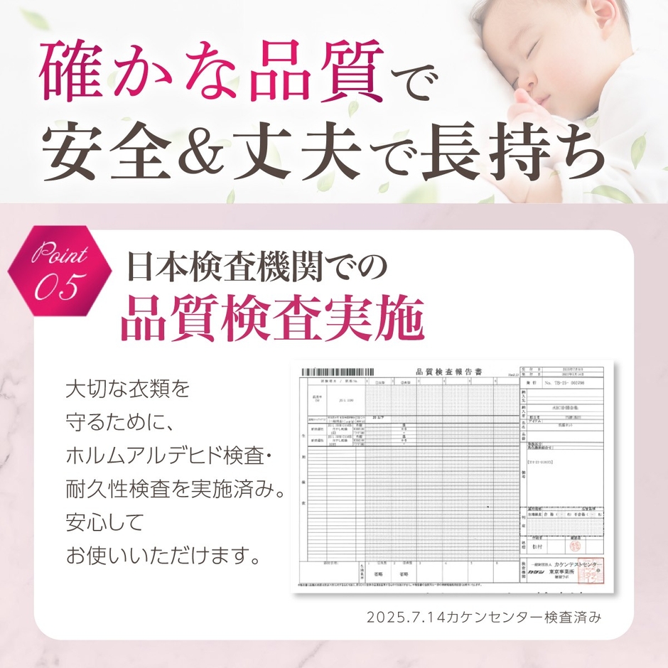 ホルムアルデヒド検査や耐久試験を国内の公的検査機関で実施済み。