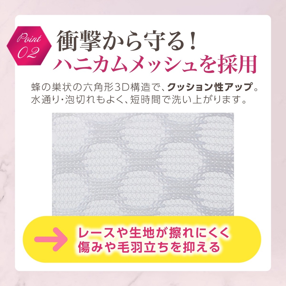3D立体フレームと蜂の巣状メッシュ(ハニカムメッシュ)による二重構造が、洗濯中の衝撃や摩擦をやさしく吸収。