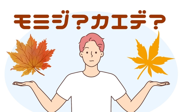 カエデは「蛙手(カエルデ)」を語源としており、葉っぱの切れ込みが浅いものを「カエデ」、深いものを「モミジ」と呼ぶ例もあるそうです。