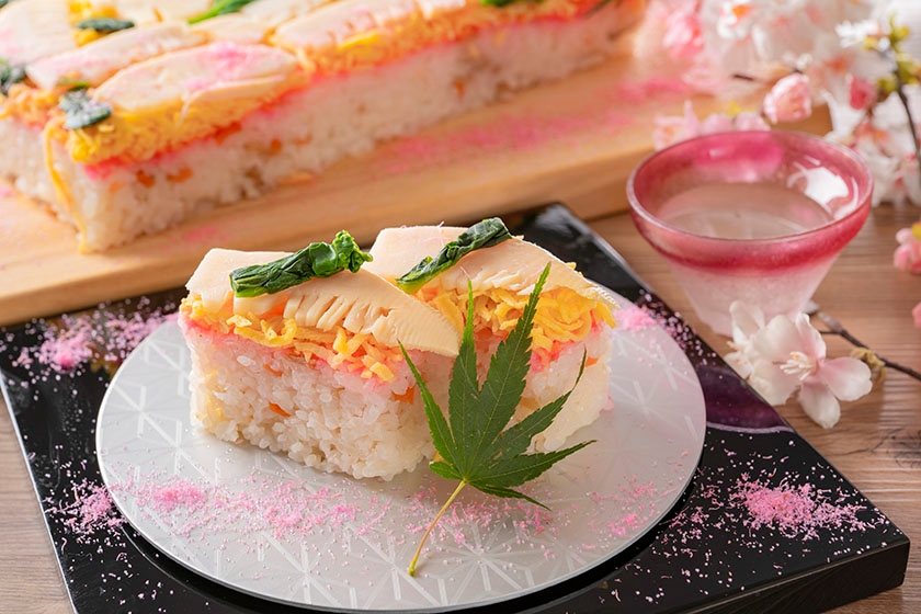 大分の郷土料理、物相ずしをアレンジした「春の箱寿司」。たけのこや菜の花など春を感じる食材を使い、桜でんぶのピンクと錦糸玉子の黄色で見た目にも春らしさを表現した一品です。