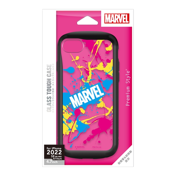 MARVELキャラクターデザインのiPhone本体の色を活かせるクリア仕様のiPhone SE 第3世代用のガラスタフケースです。背面にシールや写真を入れて自分好みにカスタマイズすることもできます。MIL規格(MIL-STD-810G)の2項目、落下・振動に準拠した試験をクリアした、耐衝撃&耐振動設計です。サイド部分はやわらかく丈夫なTPU素材でボタン周りもしっかり保護、着脱も簡単です。ガラスが万一割れてしまっても、安全な飛散防止加工済みで、お手持ちのストラップをつけて落下を防げるストラップホール付きです。