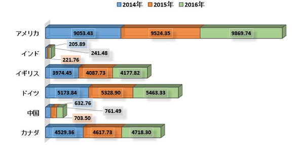 一人当たりの医療費、PPP(米ドル)– 2014-2016年