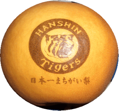 タイガースロゴ入り梨: 食べても安全なイカスミインクを使用し、特殊な印刷技術で梨(新興梨等の赤梨)にタイガースのロゴをプリント。見た目にも楽しい商品です。