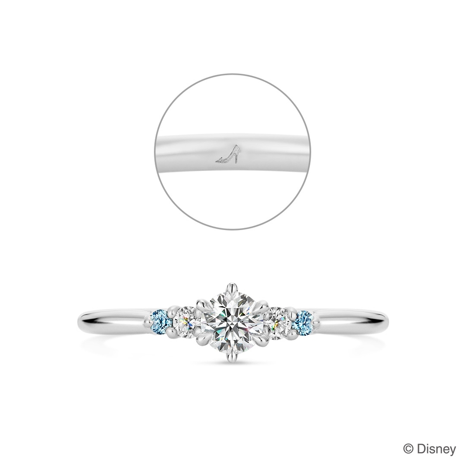 センターに輝くダイヤモンドをメインに、透明なメレダイヤモンドと、美しいブルーのドレスのような“オーシャンドロップダイヤモンド”(ブルートリートメントダイヤモンド)を添えたデザイン。側面は、物語の世界観を感じられるよう。