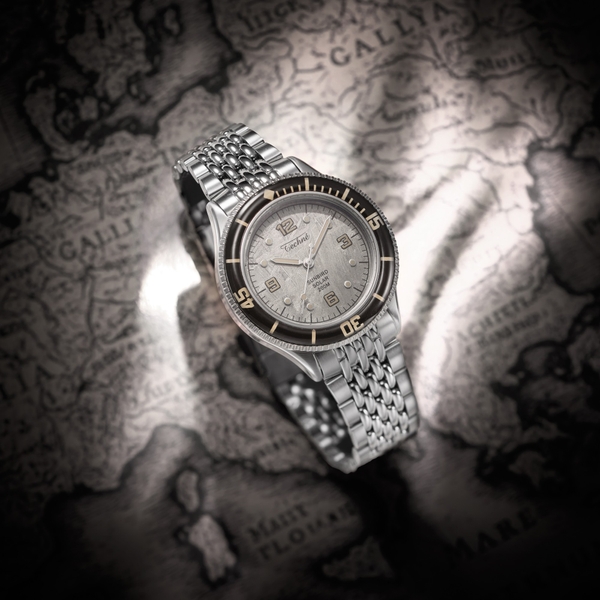 構想1年、製作2年の歳月を経て完成した今作は、特殊素材“メテオライト”“アベンチュリン”ダイヤル×200M防水×ソーラームーブメント搭載の“本気のヴィンテージダイバーズウォッチ”。“ヴィンテージとテクノロジーの融合”をテーマに掲げ、1970年代のクラシックダイバーズを現代的に再解釈。ソーラー駆動ながら、素材・機能・美しさのすべてを妥協なく仕上げた1本です。