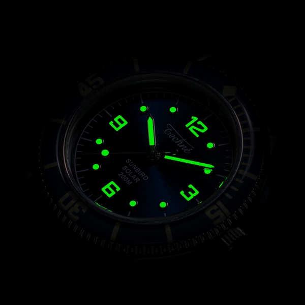 搭載されているのは、ガラスの淵から光を吸収する日本製MIYOTAソーラームーブメント。ダイバーズ機能として200M(20ATM)防水、傷に強い反射防止サファイアガラス、逆回転防止ベゼルを完備。さらに、暗所での視認性を高める強蓄光インデックス(スーパールミノバ)や、耐腐食性に優れた316Lステンレススチールを採用するなど、実用性に一切の妥協がありません。