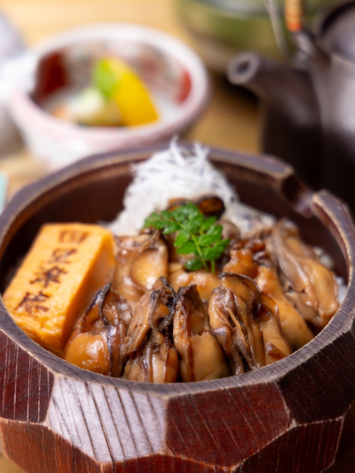 宮城県産の牡蠣を秘伝のたれでふんわりと炊き上げ、旨みを閉じ込めました。まずはそのまま、次に薬味を添えて、最後は一番出汁をかけて。味わいの変化を楽しむ“ひつまぶしスタイル”でご提供します。