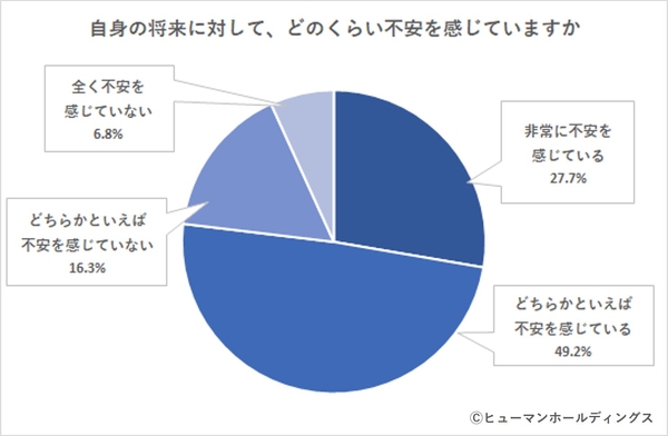 「自身の将来に対して、どのくらい不安を感じているか」という質問をしたところ「非常に不安を感じている(27.7%)」「どちらかといえば不安を感じている(49.2%)」で、76.9%が何かしらの不安を感じている結果となりました。