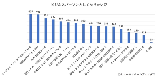 1.「ビジネスパーソンとしてなりたい姿」は、1位「ワークライフバランスを保っている」 2位「時間の使い方がうまい」 3位「社内で信頼される」