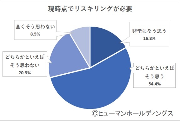 リスキリングの必要性について現時点での気持ちを質問したところ「非常にそう思う(16.8%)」、「どちらかといえばそう思う(54.4%)」で、71.2%が「リスキリングが必要」だと思っている結果になりました。