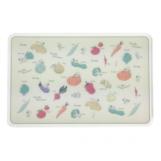 1つ目は、こちらのカッティングボードをご紹介します。野菜たちと戯れているスヌーピーがとってもキュートなデザインとなっていますね♪サイズは、210×325×9mmです。