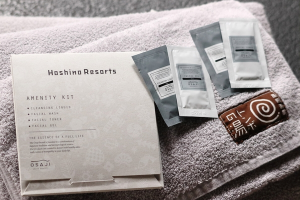 入浴時は、星野リゾートの宿泊施設で採用している日本生まれのスキンケアブランド「OSAJI(オサジ)」のアメニティを使って、肌のケアが行えます。OSAJIは、皮膚科学から学んだ安全なオーガニックコスメを提案するブランドです。入浴前の洗顔から入浴後の保湿まで優しく肌をケアします。