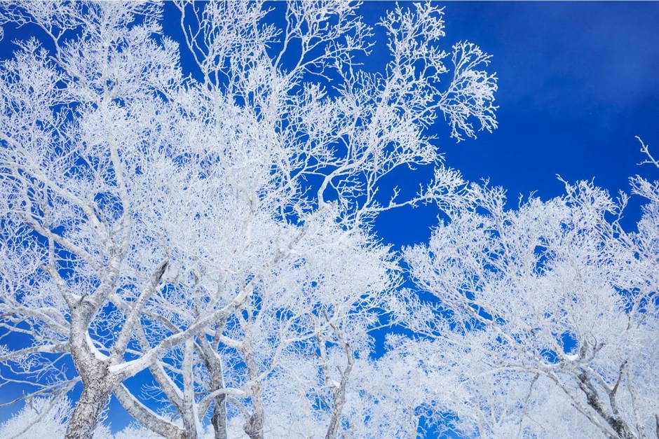 空気が澄んで晴れた日の青い空と霧氷に包まれた真っ白な雪山は、寒い地域ならではの絶景です。気温が低い朝には、空気中の水分が凍り太陽の光に照らされ、きらきらと輝くダイヤモンドダストが見られることもあり、より一層霧氷の絶景を堪能できます。この霧氷の発生確率は約58%(*1)とシーズンを通して高い確率で観賞することができます。
