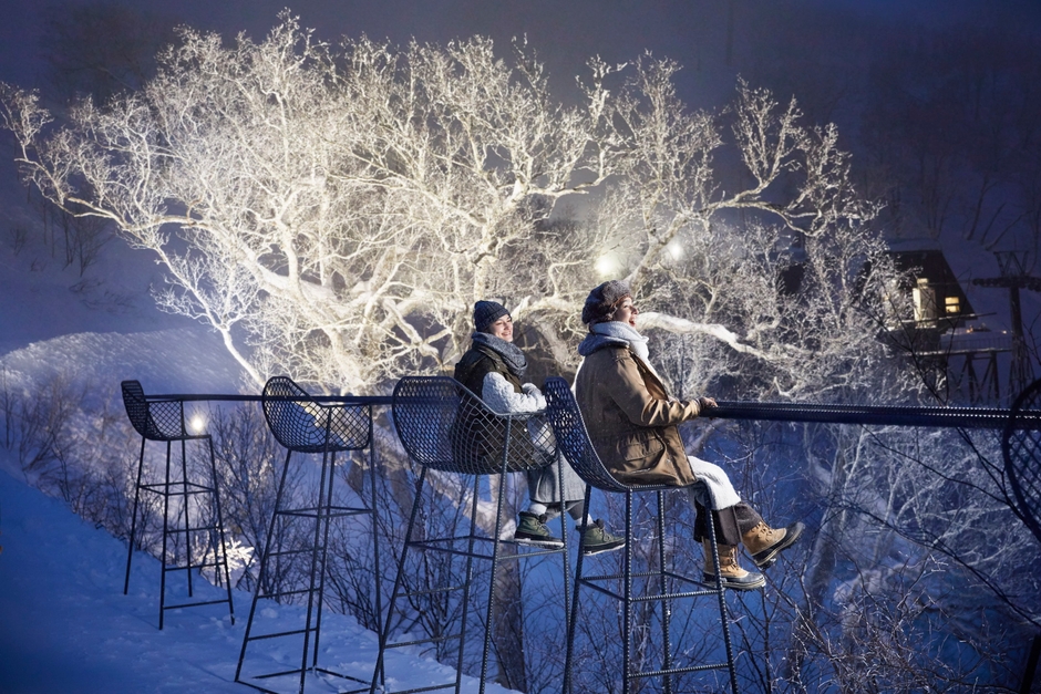 霧氷テラスは、トマム山の標高1,088メートルに位置し、木々に付く霧氷が作り出す絶景を鑑賞できるテラスです。スキー場といえば滑る人だけの場所というイメージですが、当リゾートでは滑らない人にも雪山の美しさを知って欲しいという想いから霧氷テラスを営業しています。ゴンドラに乗車し、約13分でアクセスできるため手軽に絶景を楽しめる展望スポットです。2017年より開始した夜の霧氷ライトアップは、光に照らされ浮かび上がる白い霧氷の木々が日中とは違った幻想的な景色を見せてくれます。