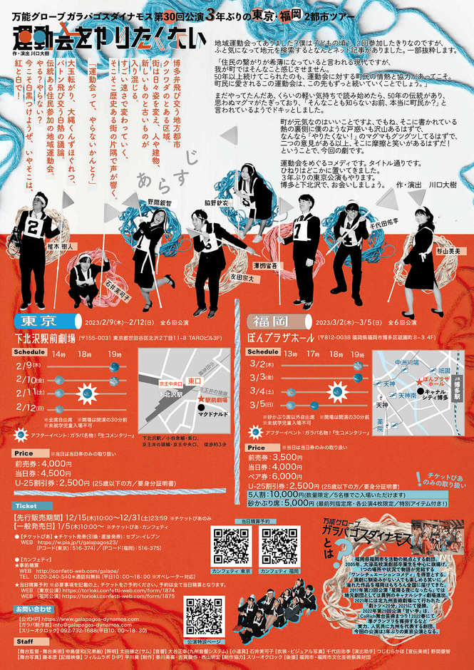 万能グローブ ガラパゴスダイナモス(主宰:椎木 樹人)、第30回公演 3年ぶりの東京・福岡2都市ツアー『運動会をやりたくない』が下記の通り上演されます。