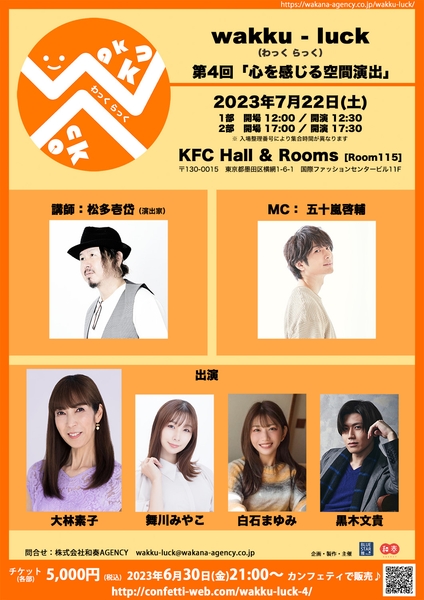 演出家 松多壱岱を講師に、ゲストに大林素子ほかを迎えて 俳優と観客が⼀緒に学ぶwakku-luck第4回「心を感じる空間演出」開催決定 カンフェティでチケット発売