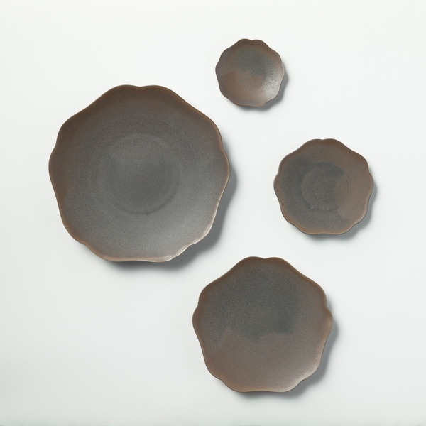 シンプルに図形化する「家紋」など古来の文様から着想を得て、花の輪郭を象った器。京都・清水焼の作家・工房の技術でつくられる繊細かつ実用的な器です。