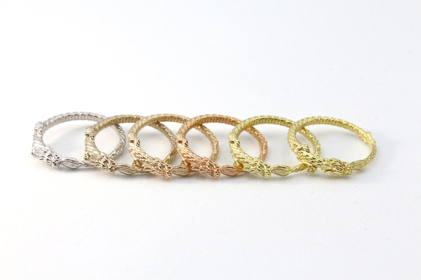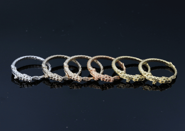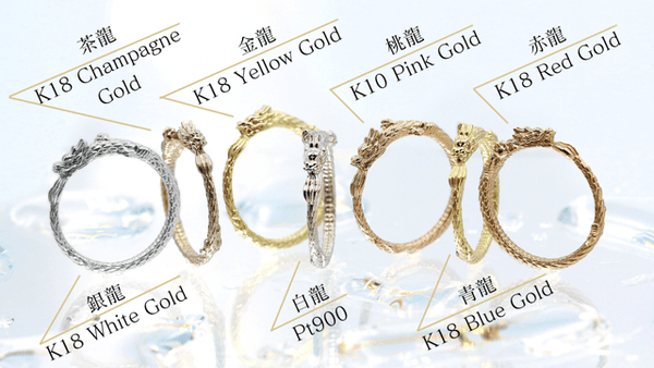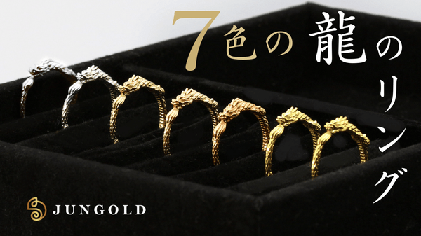 金には様々なカラーバリエーションがあります。6色の金に“白金”と言われるプラチナ900を入れた7色で構成した素材にもこだわったオシャレな龍のリングが登場。