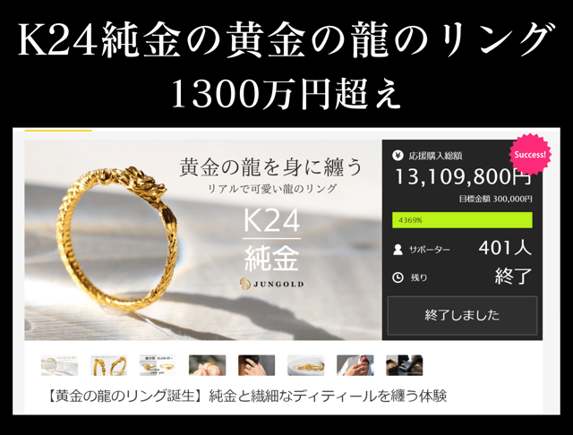 2021年にマクアケで実施した「黄金の龍のリング」のプロジェクトでは約1300万円の応援購入を頂く事が出来ました。