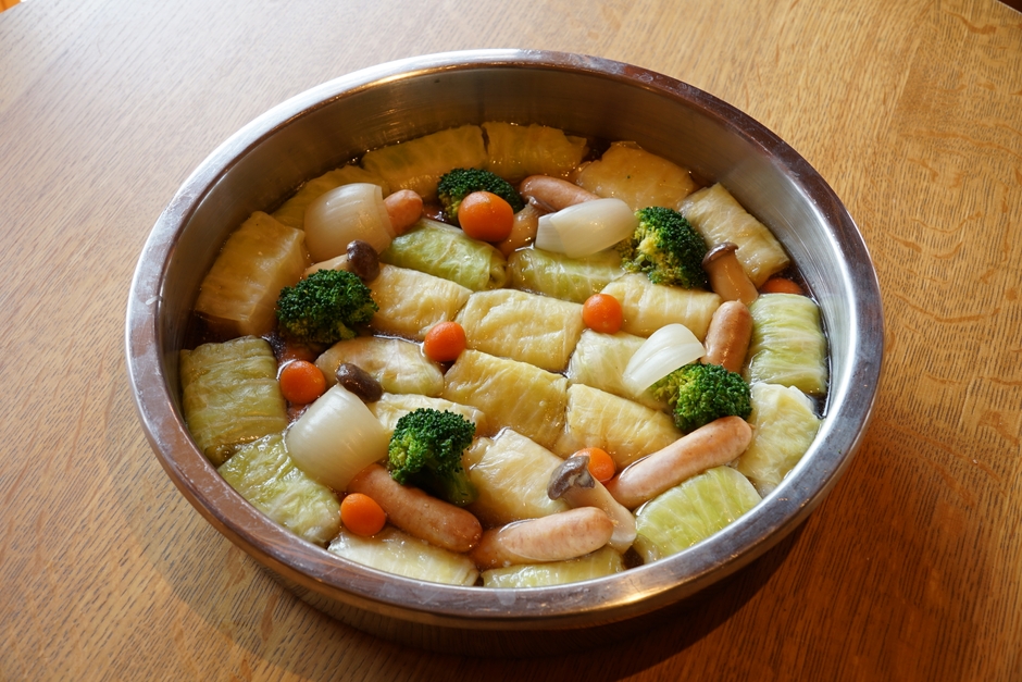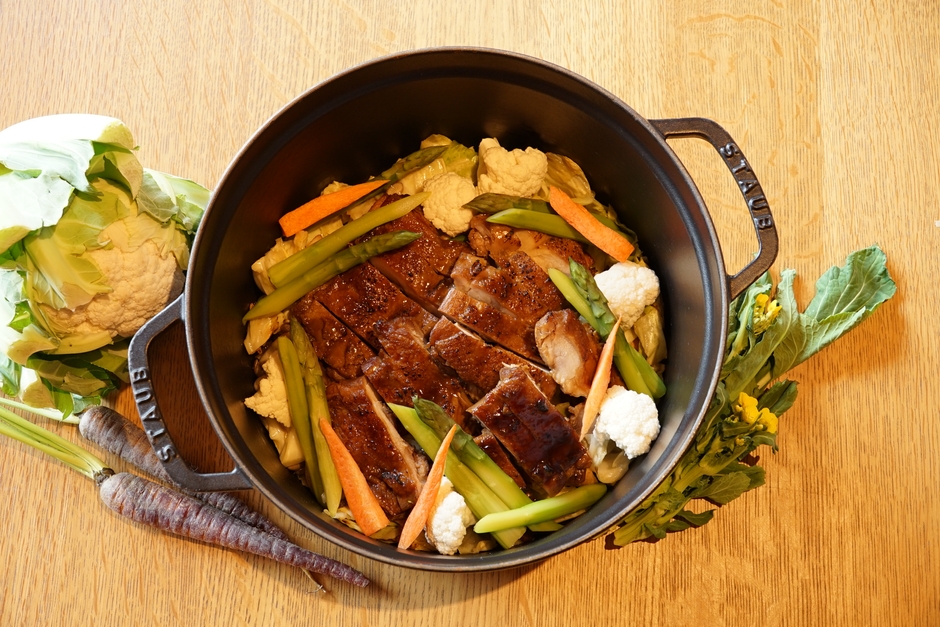 香ばしく焼き上げた照り焼きチキンに、新玉ねぎや春人参、アスパラガス、春キャベツを添えた一皿や、ロールキャベツとソーセージをコンソメ風味で煮込んだ料理など、春野菜の持ち味を生かしたメニューが並びます。