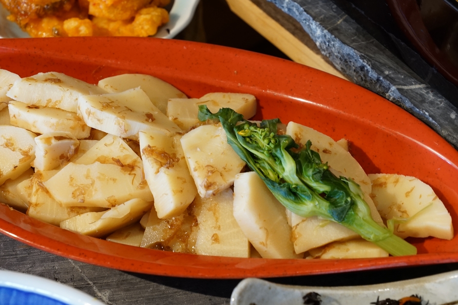 菜の花と鶏むね肉の梅和え、若竹煮、西京焼きなど、和のメニューでも春の食材を取り入れています。山菜蕎麦や筍ご飯、ちまきといったメニューもそろえ、春の味覚を楽しめる内容です。