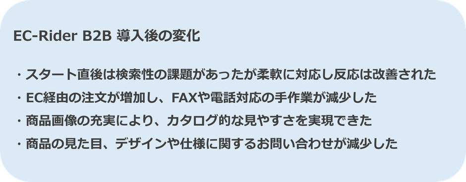 高津氏: サイトの利用率の高さを実感しています。今はネット注文で商品を購入することが当たり前になってきていますので、操作性も意識していました。EC-Rider B2Bは、写真一つとっても見せ方が大きく変わり、カタログを開いているようなイメージで使ってもらえています。