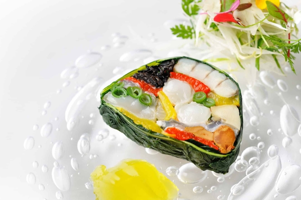 ボタンエビやカスべなど、海の幸を存分に味わうことができる一品です。魚介やキノコ、野菜など13種類の食材のそれぞれを一番おいしく味わえるよう、適した方法で調理しました。食材の余分な水分を抜くことで旨味が凝縮され、素材同士の一体感を感じることができます。爽やかな味わいを楽しめる橙(だいだい)のジュレとともに食べるのがおすすめです。