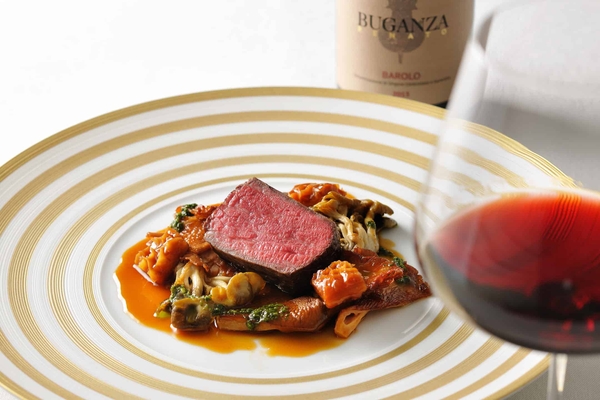 メインの牛肉のアローストに合わせるのは、イタリアのピエモンテ州で生産された「バローロ 2015」です。しっかりとした重さを楽しめる赤ワインなので、牛肉のうま味を引き立て、さらにはトマトで煮込んだトリッパとの相性も抜群です。