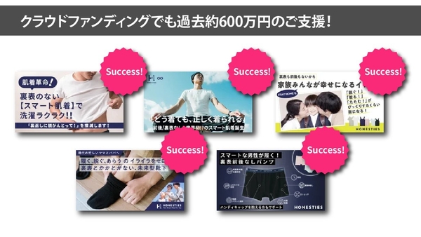 我々HONESTIESは、2018年11月に初めて「裏表のない肌着」のアイデアでテストマーケティングとしてクラウドファンディングに挑戦し話題を集めました。その後、さらに進化した裏表だけではなく前後のない肌着を開発し、こちらでも多くの子育て世代のパパママや、体が不自由なご家族を持つ方々からご好評をいただきました。