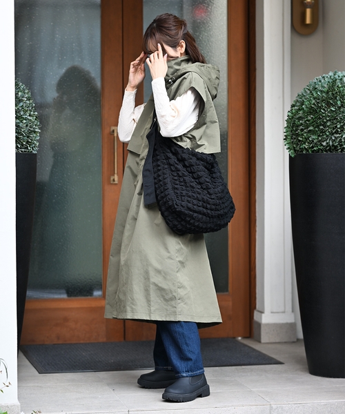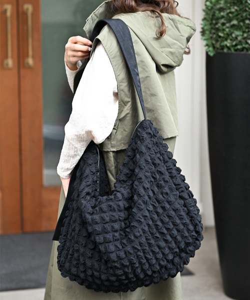 今回のコラボでは、tk.TAKEO KIKUCHIで人気のビッグサイズショルダーバッグをベースに、MUMUさんがこだわり抜いて選んだ生地を使用!ぽこぽことした素材感で今らしいコラボバッグが完成いたしました。
