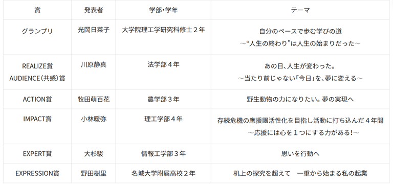 審査は野口光宣学長と伊藤志のぶ学務センター長(経済学部教授)、武藤正美常務理事・事務局長、三澤太輔業務執行理事、前回グランプリ受賞者の加藤大志さん(農学研究科農学専攻博士後期課程3年)、開学90周年企画「RISING AWARD」ファイナリストの山口春菜さんの6人で行われ、「実現」(REALIZE)、「行動力」(ACTION)、「影響力」(IMPACT)、「専門性」(EXPERT)、「表現」(EXPRESSION)の5項目を評価し、グランプリとREALIZE賞、ACTION賞、IMPACT賞、EXPERT賞、EXPRESSION賞を決定。会場参加者の投票で聴衆が最も共感したプレゼンテーションに贈られる「AUDIENCE(共感)賞」も1人が選ばれました。