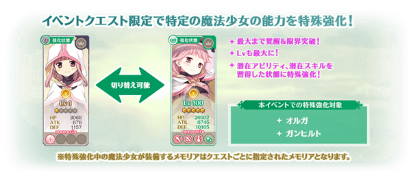 対象の魔法少女を編成して本イベントクエストをプレイする際に、ステータスを特殊な状態に強化することができます。