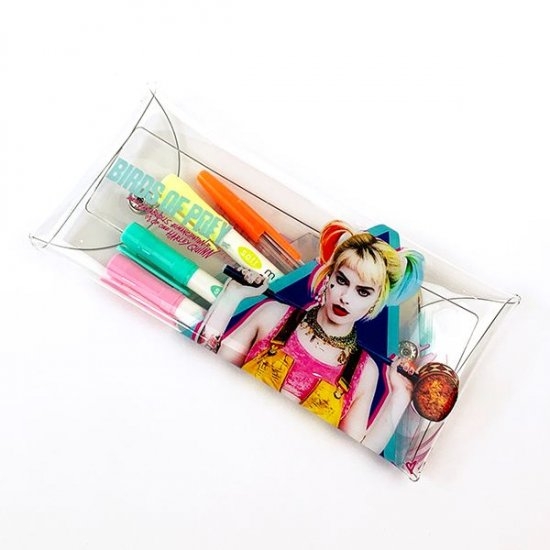 ペンケースほどのサイズのクリアマルチケースです。さすがハーレイ・クイン色合いがカラフル!前作からコスチュームや髪の長さも変わって新しい装いのハーレイ・クインですね。きりっとした表情のカッコいいデザイン♪