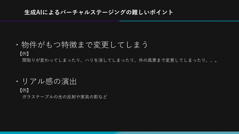 そこで、プロンプト入力・パラメータ設定の研究や画像処理技術の活用などにより物件に合わせた『バーチャルステージング』を実現し、自然な物件写真を作成できるようになりました。
