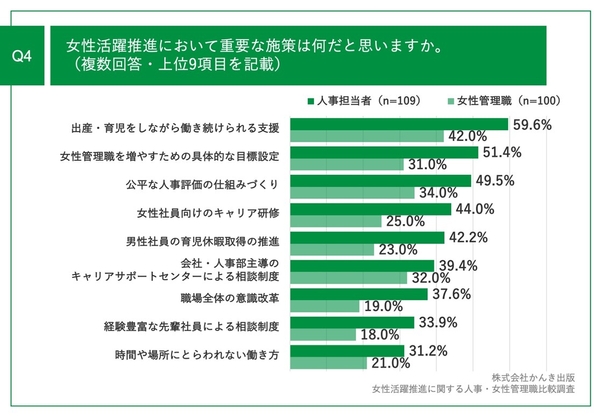 「Q4.女性活躍推進において重要な施策は何だと思いますか。(複数回答)」と質問したところ、人事担当者(n=109)・女性管理職(n=100)ともに、「出産・育児をしながら働き続けられる支援」が最多の結果になりました。