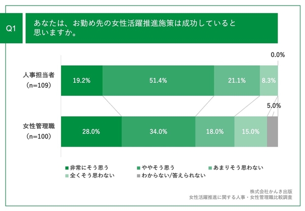 「Q1.あなたは、お勤め先の女性活躍推進施策は成功していると思いますか。」と質問したところ、人事担当者(n=109)は70.6%が「そう思う」、女性管理職(n=100)は62.0%が「そう思う」と回答しました。