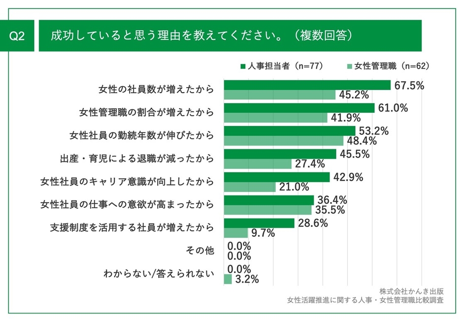 Q1で「非常にそう思う」「ややそう思う」と回答した方に、「Q2.成功していると思う理由を教えてください。(複数回答)」と質問したところ、人事担当者(n=77)は「女性の社員数が増えたから」(67.5%)、女性管理職(n=62)は「女性社員の勤続年数が伸びたから」(48.4%)が最多の結果になりました。