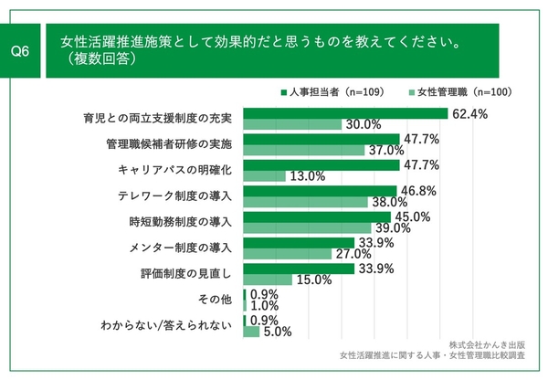 「Q6.女性活躍推進施策として効果的だと思うものを教えてください。(複数回答)」と質問したところ、人事担当者(n=109)は「育児との両立支援制度の充実」(62.4%)、女性管理職(n=100)は「時短勤務制度の導入」(39.0%)が最多の結果になりました。