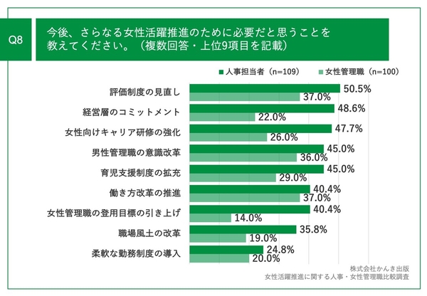 「Q8.今後、さらなる女性活躍推進のために必要だと思うことを教えてください。(複数回答)」と質問したところ、人事担当者(n=109)・女性管理職(n=100)ともに、「評価制度の見直し」が最多の結果になりました。
