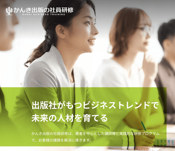 かんき出版の社員研修は、ビジネストレンドを発信し続けている出版社による法人向け研修サービスです。出版コンテンツと著者ネットワークを活かした講演・研修は、「ここでしか聞けない」ものばかり。じっくりとヒアリングをしたうえで、未来に向かって、「今」必要とされるプログラムをお届けします。