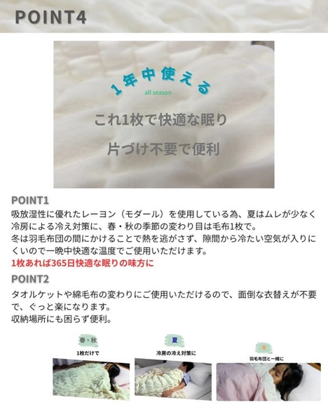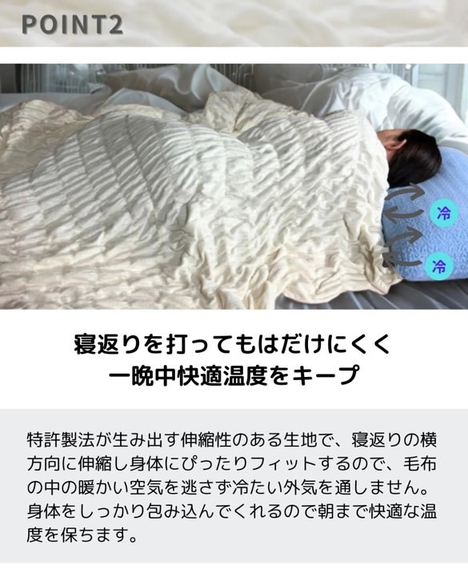 100年以上の老舗メーカーだから作れる。究極のやわらかさ・心地よさを追求した毛布 特許製法が生み出す仕様で寝返りのたびに身体にやさしくフィットし一晩中快適 365日使える。面倒な衣替えも不要。丸洗いできるから清潔