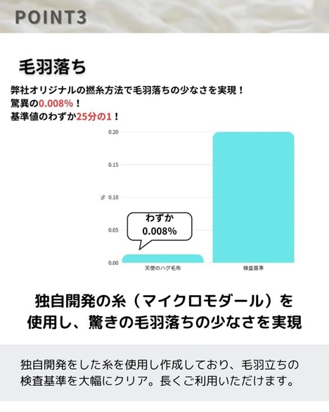 いろいろな素材がある中、「天使のハグ毛布」はマイクロモダールを使用しています。マイクロモダールは天然のブナの木から生まれた再生繊維です。その繊維はとても細く、まるでシルクのような光沢としっとりなめらかな風合いが特徴です。さらに、弊社オリジナルの撚糸方法で糸を撚り戻す事でふっくら柔らかな風合いに仕上げました。
