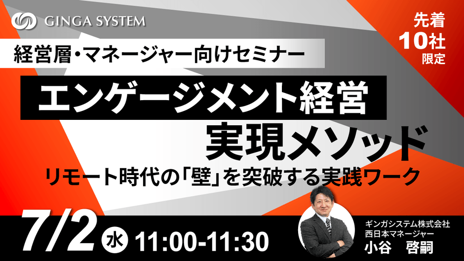 ギンガシステム株式会社は、企業の経営者およびマネージャー・人事担当者を対象に、無料オンラインセミナー「エンゲージメント経営 実現メソッド ─ リモート時代の『壁』を突破する実践ワーク」を開催いたします。