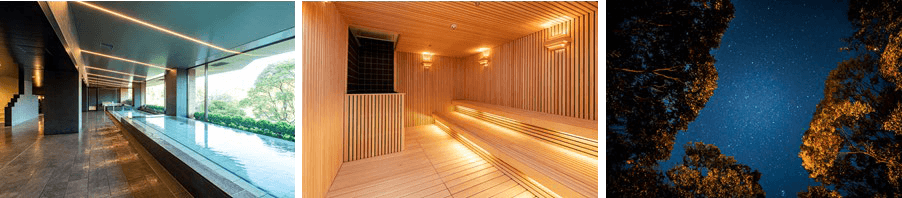 「RESOL NO MORI CAMP SITE」にご宿泊の方はもれなく、併設するスポーツ施設「メディカルトレーニングセンター(MTC)」内のサウナ付き温浴施設「長柄カルナの湯」をご利用いただけます。自慢の準天然温泉をはじめ、炭酸泉「ラムネの湯」や、身体の芯から温めるサウナも完備しています。さらに、オールレンタルの「手ぶらでキャンプサイト(2 サイト限定)」をはじめとしたレンタルサービスとしてご利用いただけるグッズには、キャンプ大国オーストラリアから直輸入した本格的な寝袋や、冬でも温かく過ごせる湯たんぽもご用意しており、これからの“冬キャンプ”の入門に最適な環境を整えています。なお、新設の「レイクビューサイト」とエリア拡張した「フォレストサイト」は、18 歳以上の大人限定の利用としており、落ち着いた環境で、冬の澄んだ夜空の満天の星空を堪能する、ここでしかできない特別な体験をご提供します。