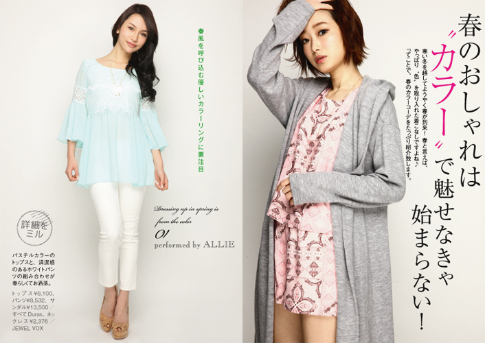 ファッション特集としては、人気ファッションモデルの「水沢アリー」「尾崎紗代子」「菜香」「ヴィエンナ」ら豪華出演で、春のおススメカラーコーデをセレクトした「春のおしゃれは“カラー”で魅せなきゃ始まらない!」や、ワンピースの着こなしを提案する「欲しかった“大人カワイイ”春ワンピ」を展開。