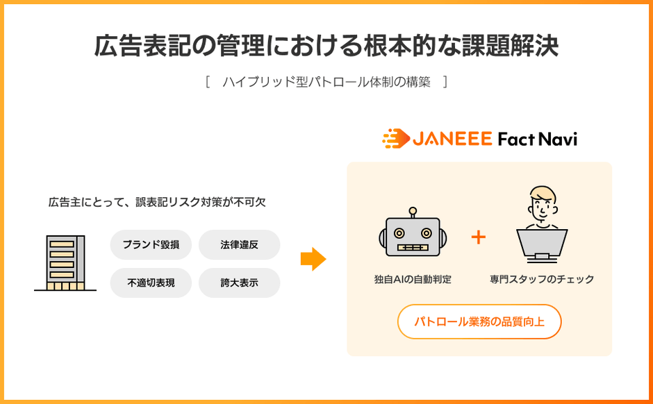 JANEEE Fact Naviは、JANetの広告審査を通じて蓄積した知見を学習させた独自のAIが、広告表記をチェックします。専門スタッフによる目視を組み合わせる事で「ハイブリッド型パトロール」体制を構築し、品質管理の改善につなげています。
