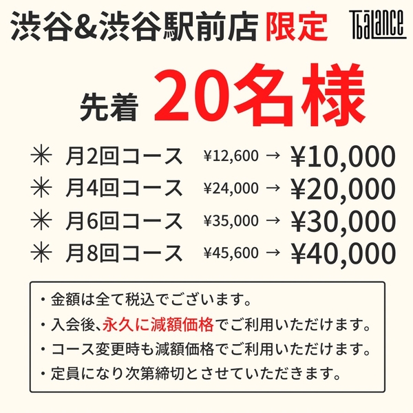 渋谷店・渋谷駅前店20名様限定!9月入会で、月会費が最大¥5,600も『永久に』お得になるキャンペーンを実施中!